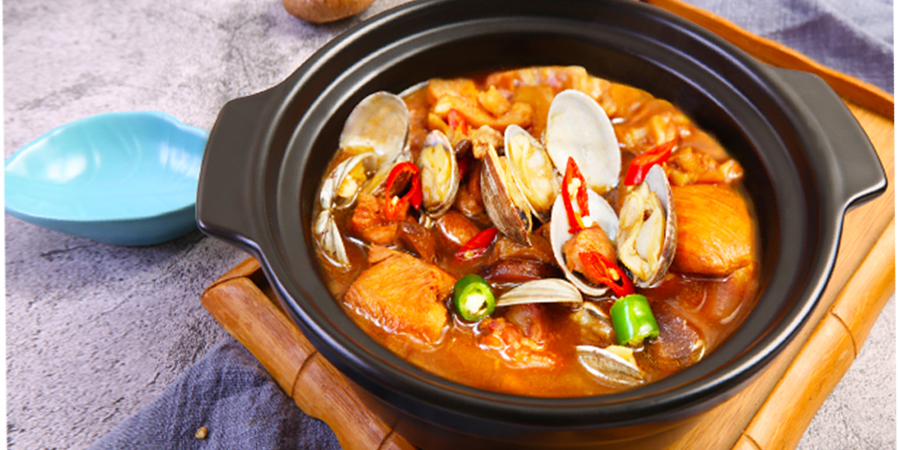 經(jīng)過(guò)數(shù)十種香料和名貴藥材的秘制醬料精心烹飪而成,用土制燒制而成,雞塊在砂鍋內(nèi)沸騰...